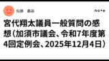 一般質問に対する感想として、率直に申し上げて、態度・内容とも、共感できるところの少ない質問でした。それをメールやDMでお伝えするのでも、私自身のSNSで発信するのでもなく、こちらのコメントに書き込むことにしたのは、従来のように宮代さんの発信だけが一方的に流れている状況より、反論・対立意見が目に見える形で置かれている方が健全だと考えるからです。同日中の宮代さんのX上での発信を見て、なおさらそのように思いました。